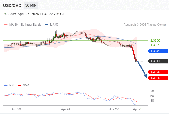 在 1.3645 之下,看跌,目标价位为 1.3575 ,然后为 1.3555 。