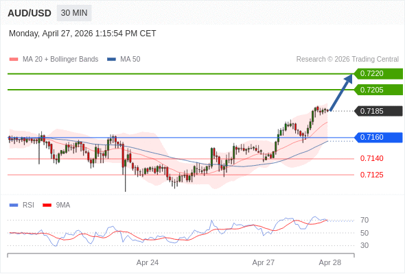 在 0.7160 之上,看涨,目标价位为 0.7205 ,然后为 0.7220 。