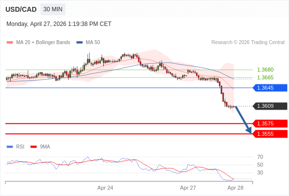 在 1.3645 之下,看跌,目标价位为 1.3575 ,然后为 1.3555 。