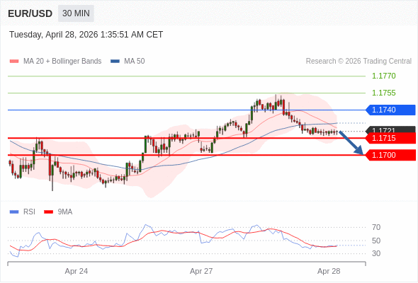 在 1.1740 之下,看跌,目标价位为 1.1715 ,然后为 1.1700 。