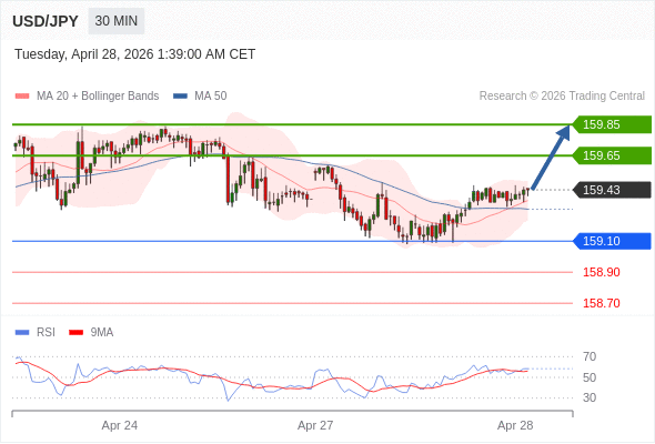 在 159.10 之上,看涨,目标价位为 159.65 ,然后为 159.85 。