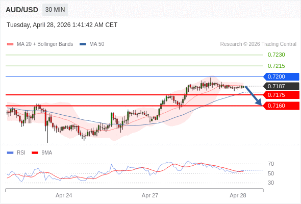 在 0.7200 之下,看跌,目标价位为 0.7175 ,然后为 0.7160 。