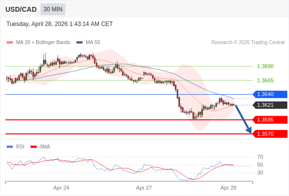 在 1.3640 之下,看跌,目标价位为 1.3595 ,然后为 1.3570 。