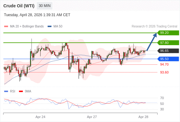 在 95.50 之上,看涨,目标价位为 97.80 ,然后为 99.20 。