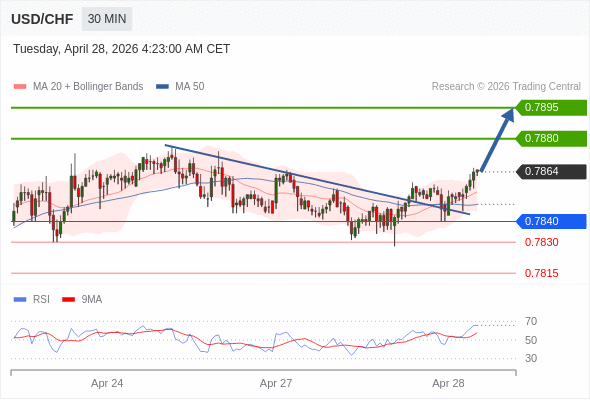在 0.7840 之上,看涨,目标价位为 0.7880 ,然后为 0.7895 。