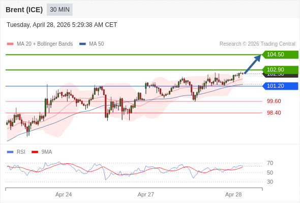 在 101.20 之上,看涨,目标价位为 102.90 ,然后为 104.50 。