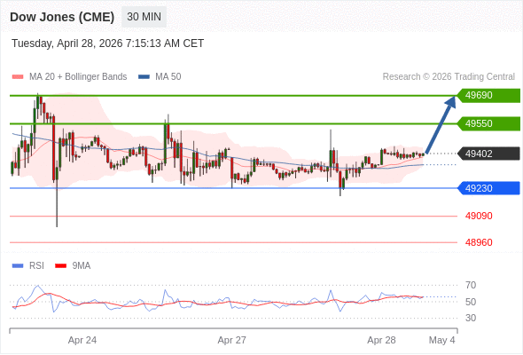 在 49230 之上,看涨,目标价位为 49550 ,然后为 49690 。