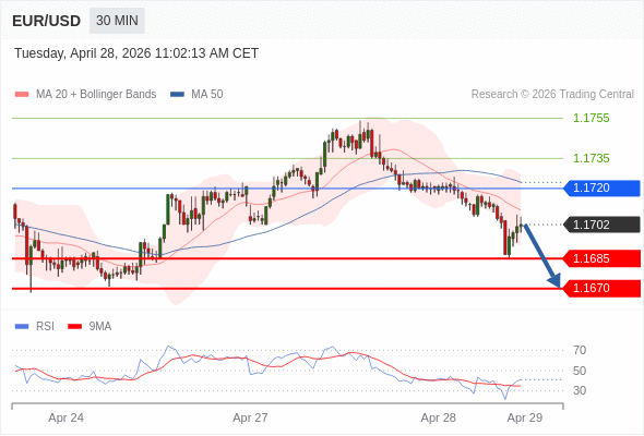 在 1.1720 之下,看跌,目标价位为 1.1685 ,然后为 1.1670 。