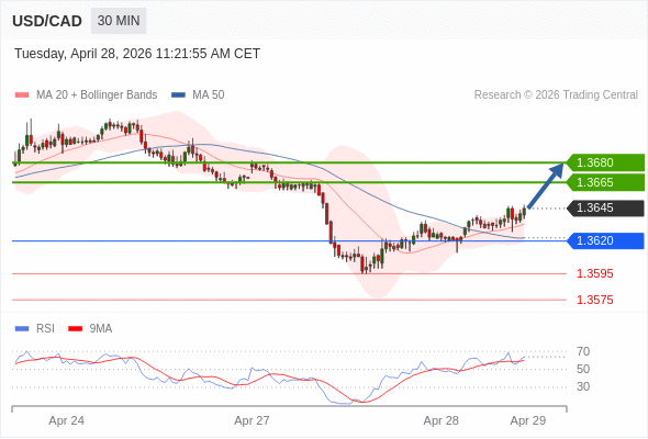 在 1.3620 之上,看涨,目标价位为 1.3665 ,然后为 1.3680 。