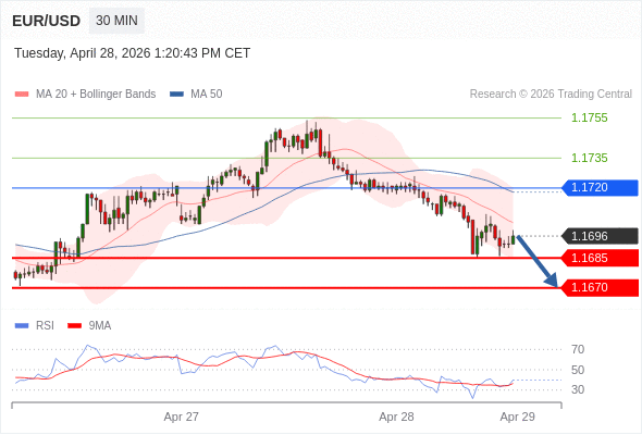 交易策略: 在 1.1720 之下,看跌,目标价位为 1.1685 ,然后为 1.1670 。