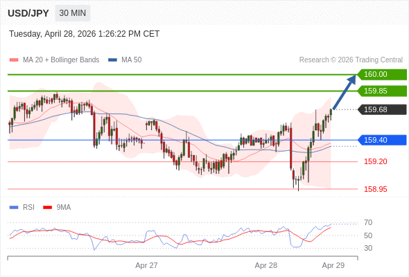在 159.40 之上,看涨,目标价位为 159.85 ,然后为 160.00 。