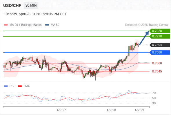 在 0.7880 之上,看涨,目标价位为 0.7910 ,然后为 0.7920 。