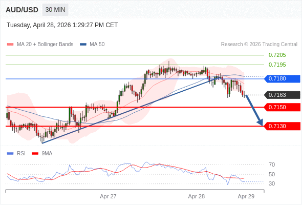 在 0.7180 之下,看跌,目标价位为 0.7150 ,然后为 0.7130 。