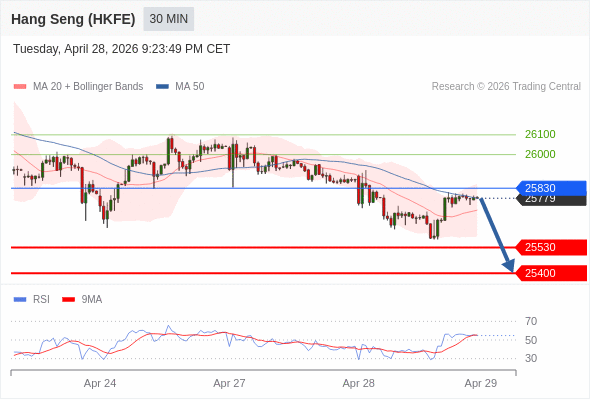 交易策略: 在 25830 之下,看跌,目标价位为 25530 ,然后为 25400 。