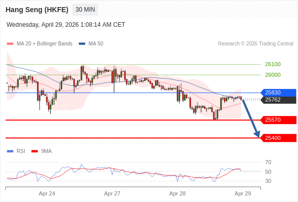 交易策略: 在 25830 之下,看跌,目标价位为 25570 ,然后为 25400 。