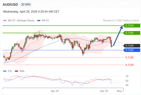 在 0.7160 之上,看涨,目标价位为 0.7195 ,然后为 0.7210 。
