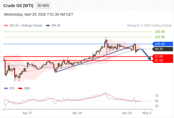 交易策略: 在 100.40 之下,看跌,目标价位为 97.80 ,然后为 97.00 。