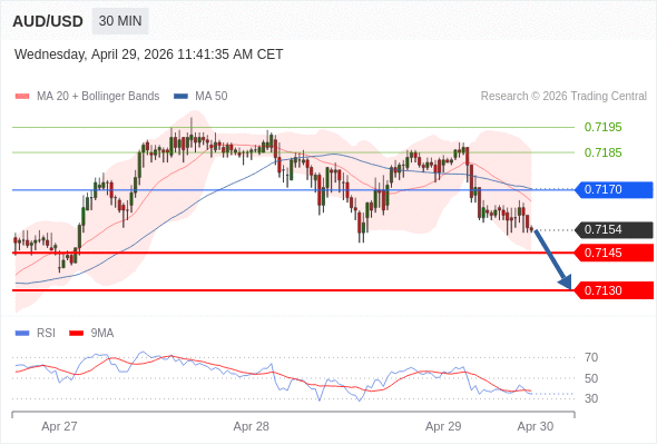 在 0.7170 之下,看跌,目标价位为 0.7145 ,然后为 0.7130 。