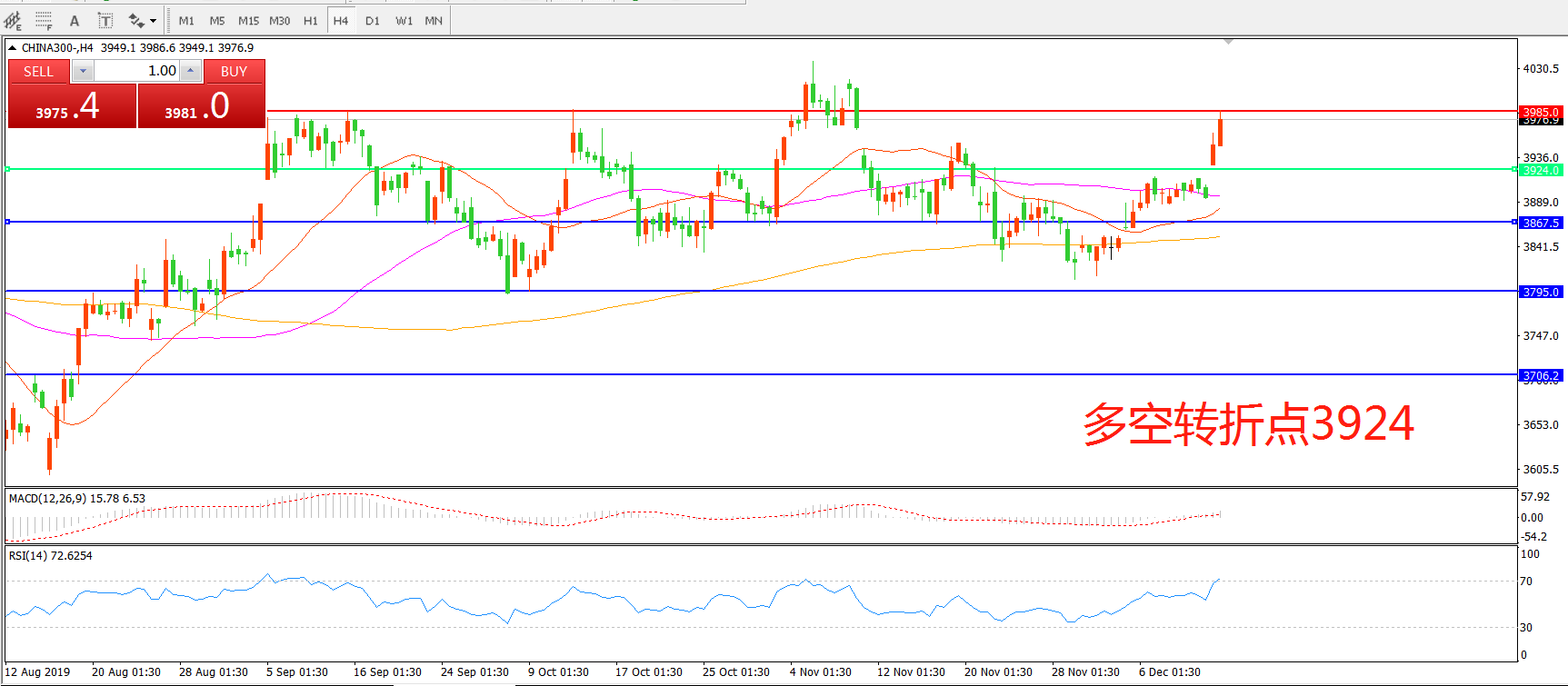 周四(12月13日),受中美经贸关系改善及中央经济工作会议部署2020年经济工作影响,沪指大涨近2%,逼近3000点大关,沪深300大幅反弹,收报3975点。科技股在大部分时间里充当了护盘力量;而当周五以券商、保险、银行为首的蓝筹股接过领涨接力棒,从近期政策面的信号来看,稳健的货币政策要灵活适度,保持流动性合理充裕,政策强调要更好缓解民营和中小微企业融资难融资贵问题,这意味着利率下降是2020年的核心主线,大盘有望延续修复性反弹,三千大关能否突破成为短期市场情绪的风向标。
