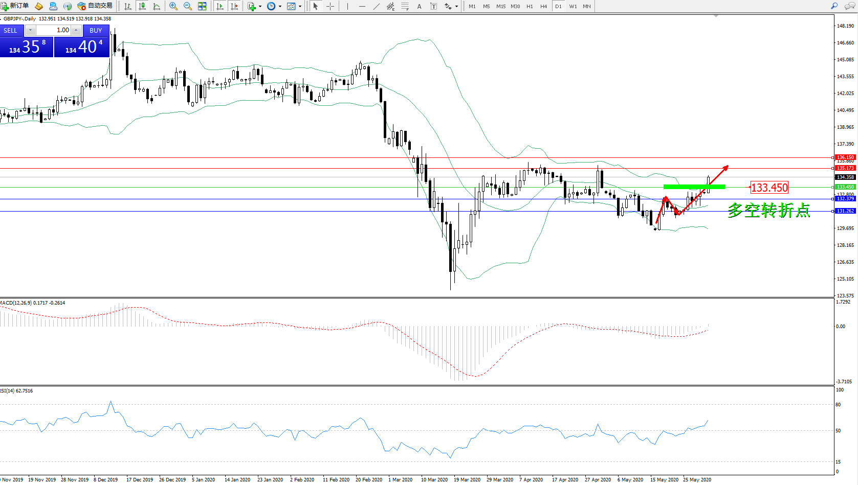交易策略:133.450上方看涨,目标135.173、136.150