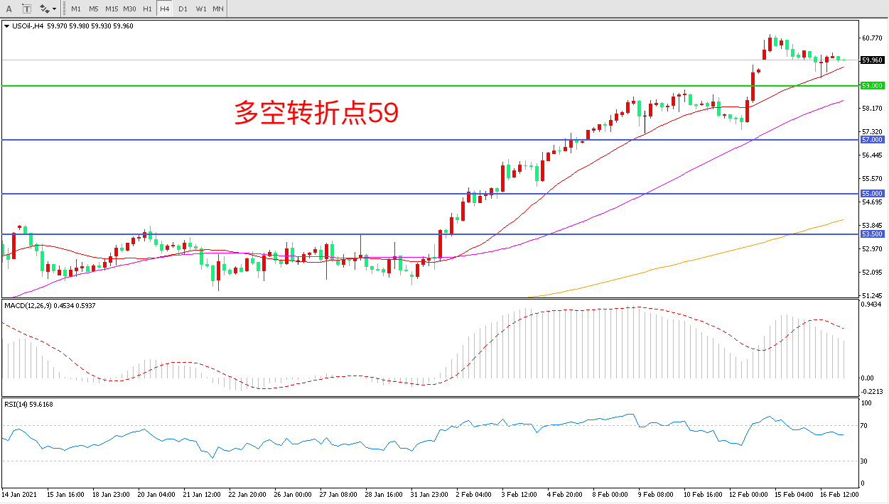 2月16日),历史性冬季风暴袭击美国北美最大的炼油厂被迫关闭,市场担忧得州的极端寒冷天气可能导致油井停产和物流问题,或致供应中断,美国WTI原油再度上扬,收报59.92美元/桶。由于市场对美国经济刺激计划将对提振经济及能源需求怀有很大信心,风险情绪氛围良好,刺激原油价格不断走高