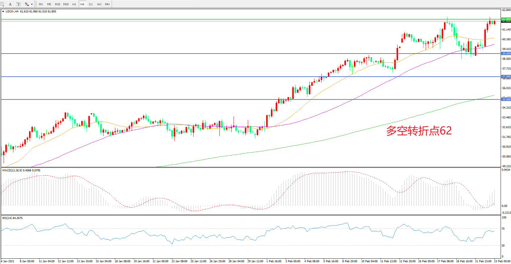 4小时图看,油价回踩55周期均线后长阳拉升,多头情绪情绪高涨,62美元成为多空分水岭,均线系统仍呈多头排列,MACD红柱增加,RSI指标向上,日内延续上行概率较大。