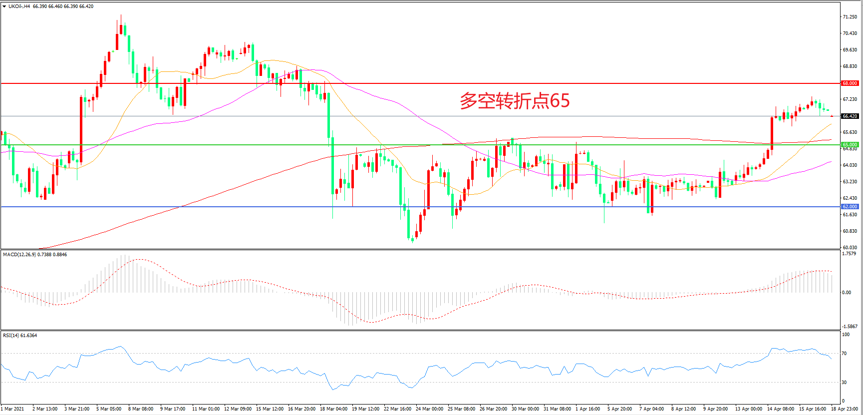 4小时图看,油价长阳拉升,突破前期整理区间,整体表现偏强,均线系统粘合形成下方支撑,65美元成为多空分水岭,MACD红柱增加,RSI指标走平,日内延续上行概率较大。