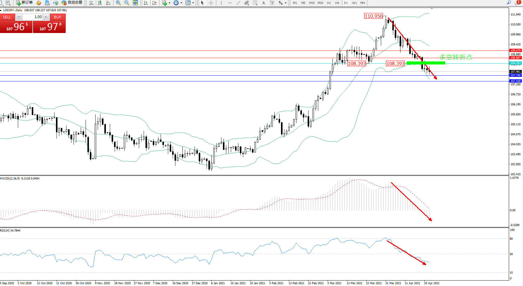 交易策略:108.393下方看跌,目标107.740、107.430