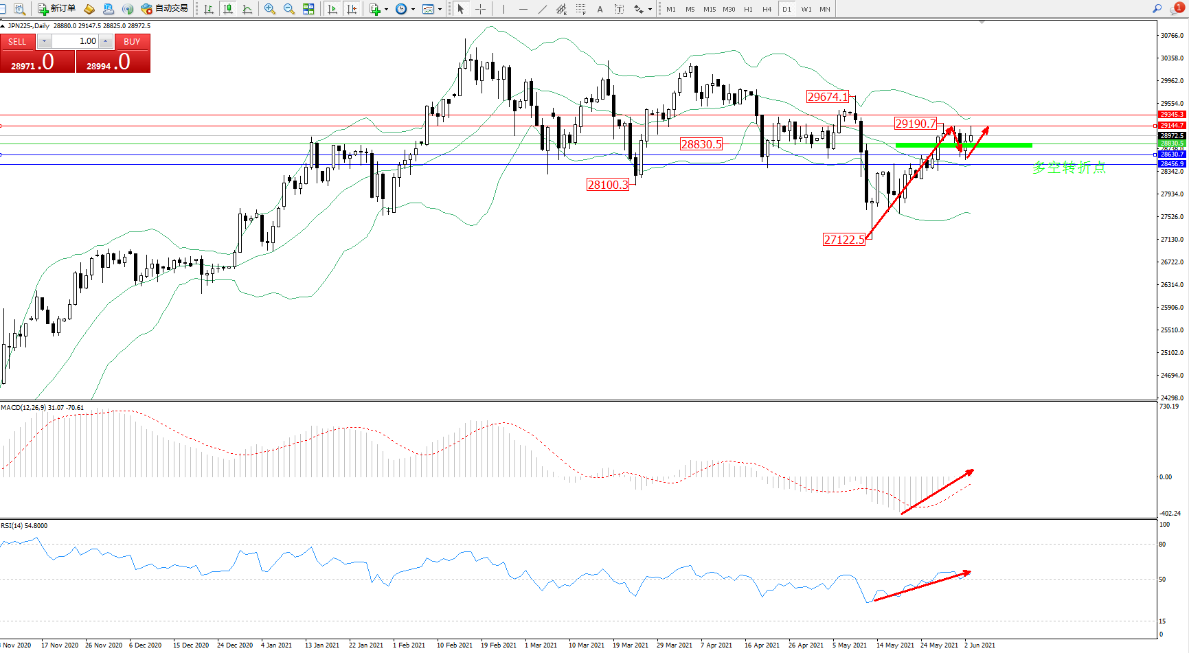 技术点评:空头动力急速下挫后,低位多头反转震荡上扬,抵达29190位置遇阻开始震荡回撤,短期力或将维持,布林带指标通道呈向下移动后处于收口走势中,且有反转迹象,MACD指标处于空头区域低位震荡缓慢回升至0轴线上方附近徘徊,RSI指标处于50均衡线上側维持震荡;