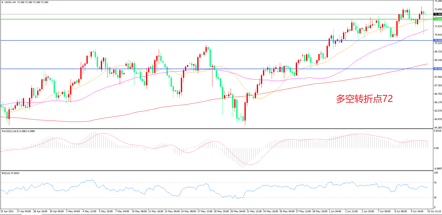 4小时图看,油价延续高位震荡,整体表现偏强,21周期均线成为下方支撑,72美元成为中期多空分水岭,MACD红柱减少,RSI指标走平,日内延续震荡概率较大。
