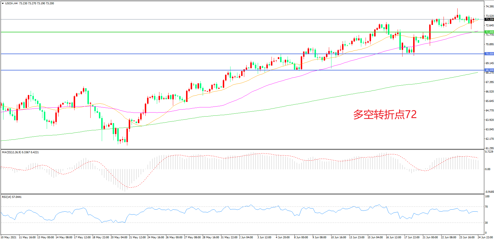 4小时图看,油价突破72美元阻力后再度上行,短期表现强势,均线系统成为下方支撑,MACD红柱增加,RSI指标走平,日内震荡上行概率较大。