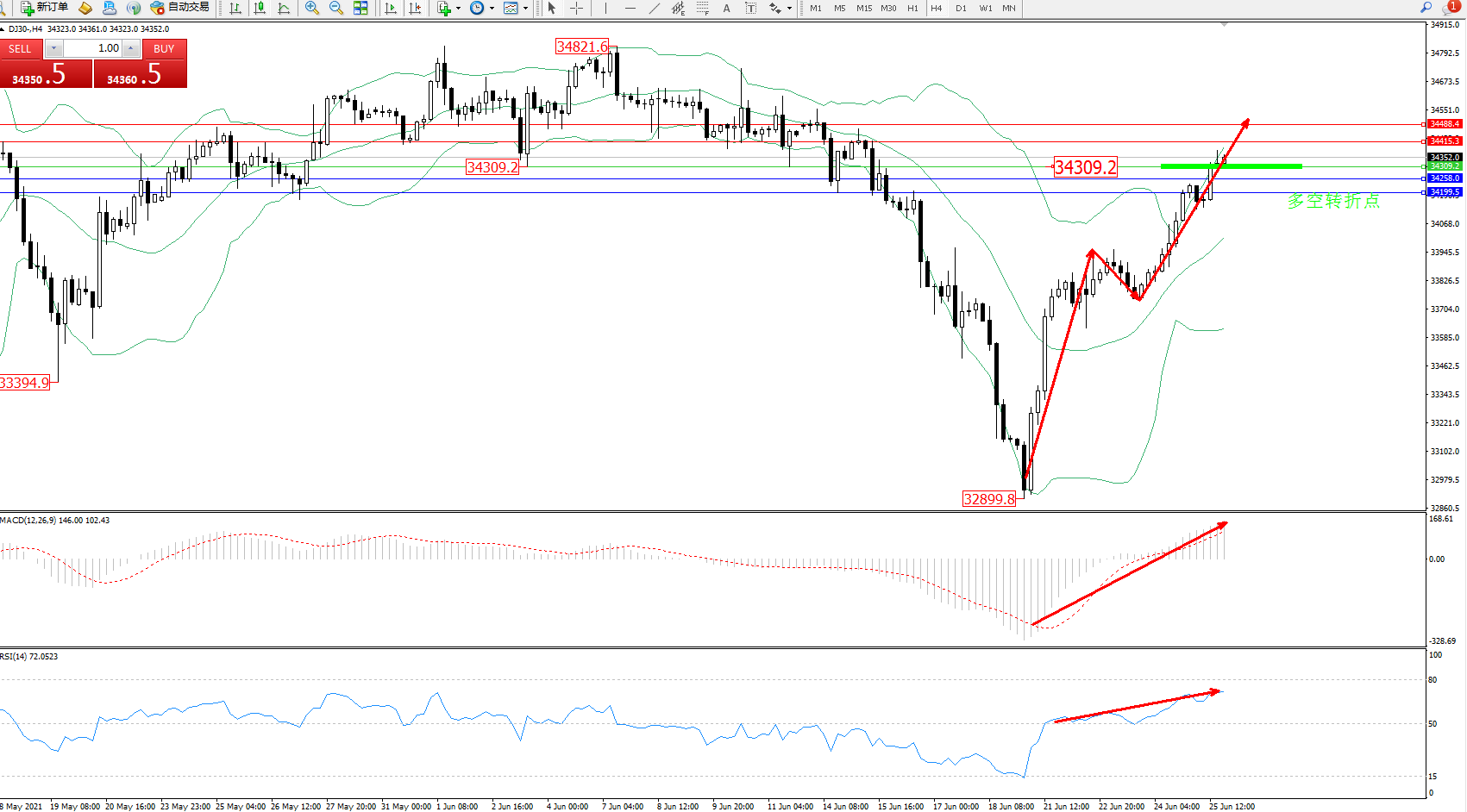 交易策略:34309上方看涨,目标34415、34488