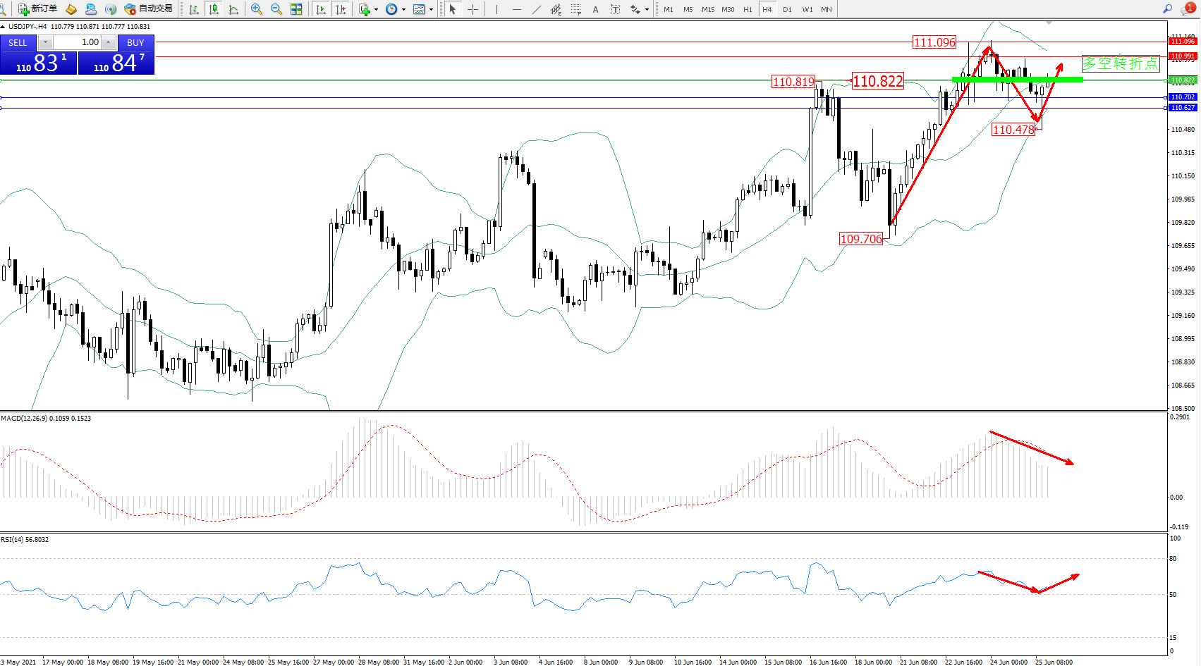 交易策略:110.822上方看涨,目标110.991、111.096
