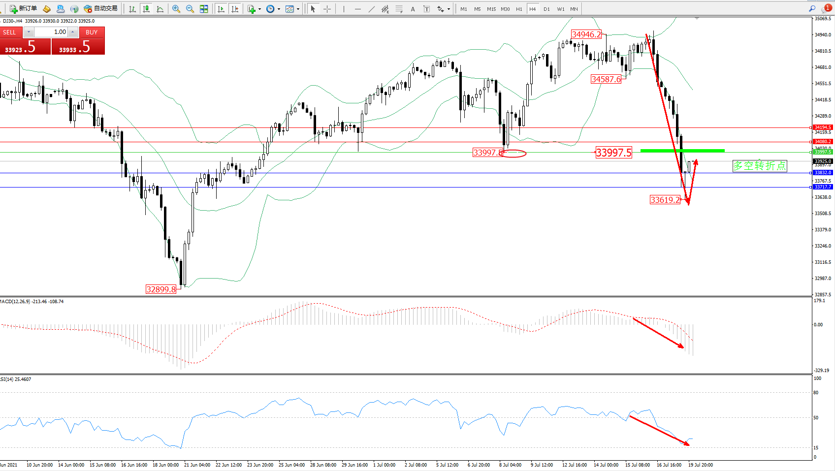 交易策略:33997下方看跌,目标33832、33717