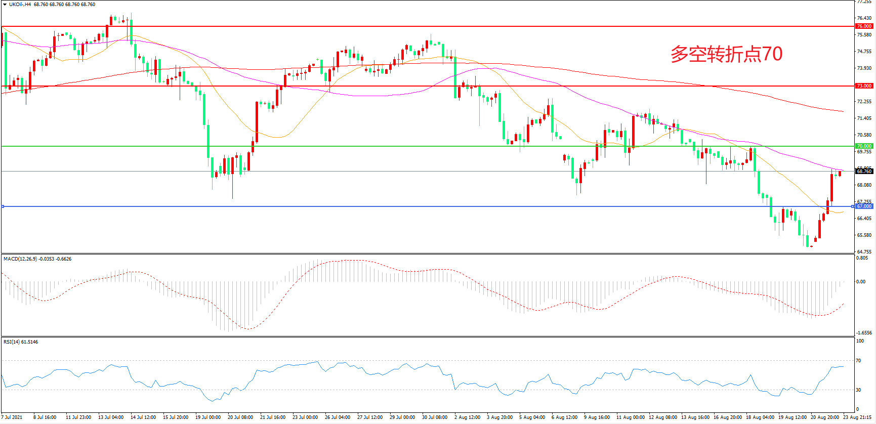 交易策略:在70.00之下看跌,目标67.00                 63.00