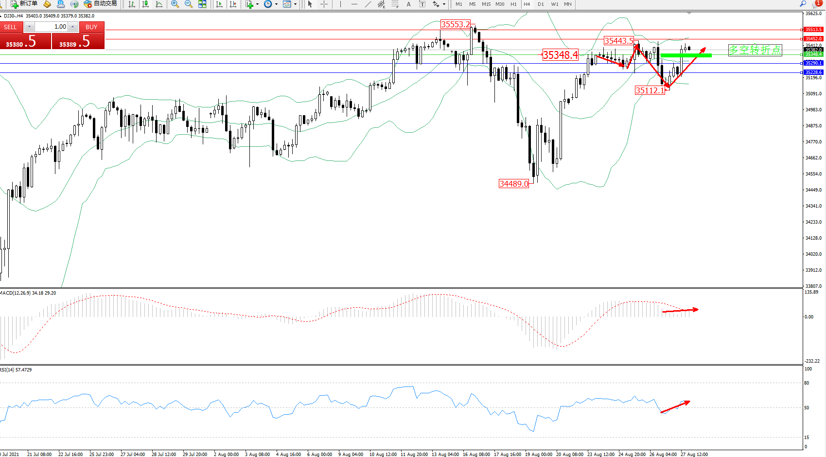 道琼斯指数DJ30——4小时K线图显示: