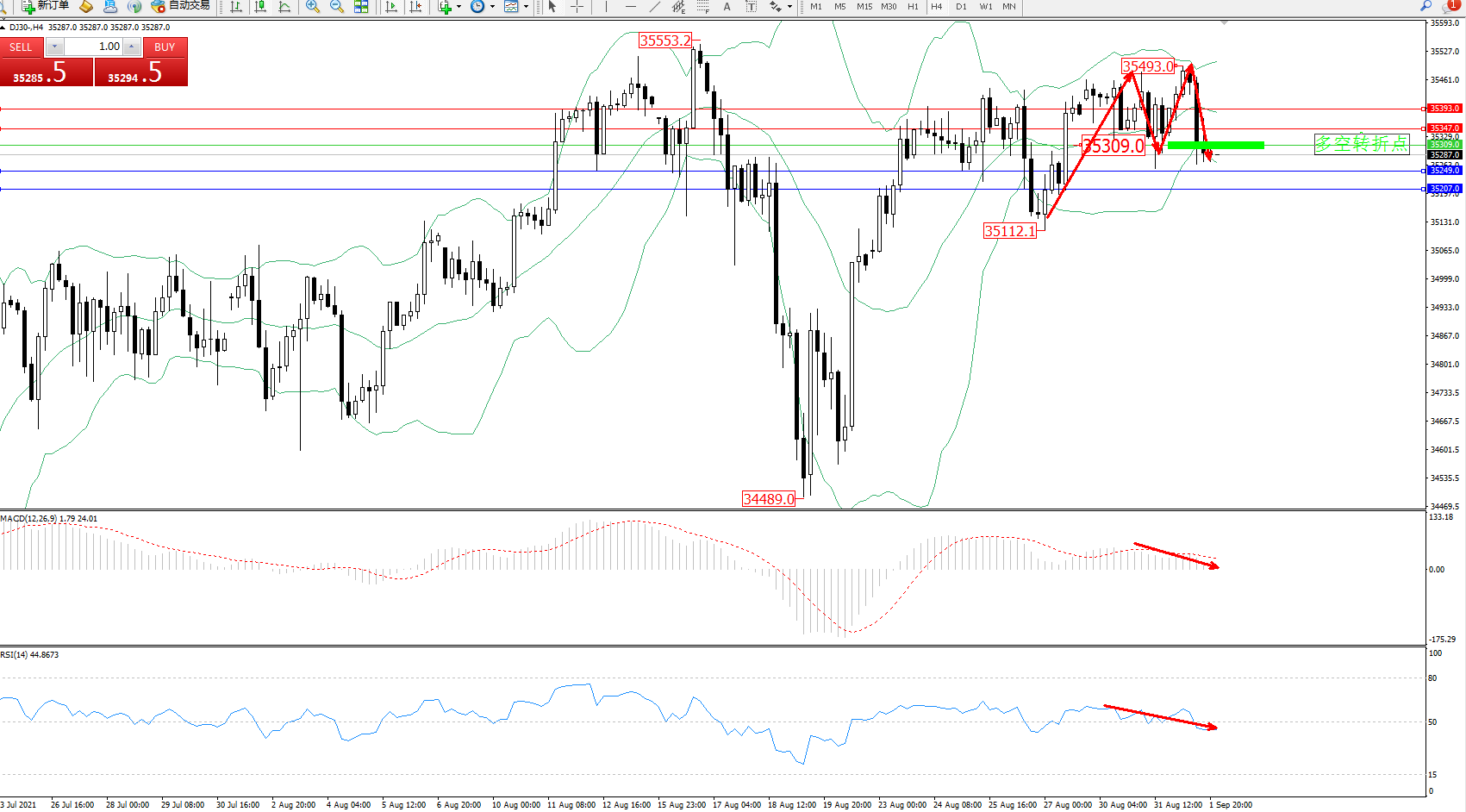 交易策略:35309下方看跌,目标35249、35207