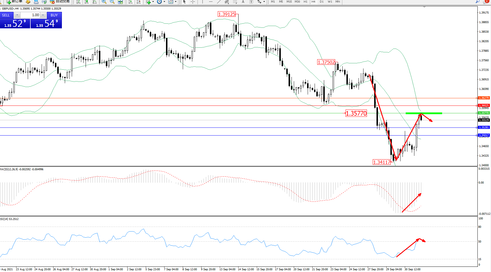 交易策略:1.35770下方看跌,目标1.35281、1.35017