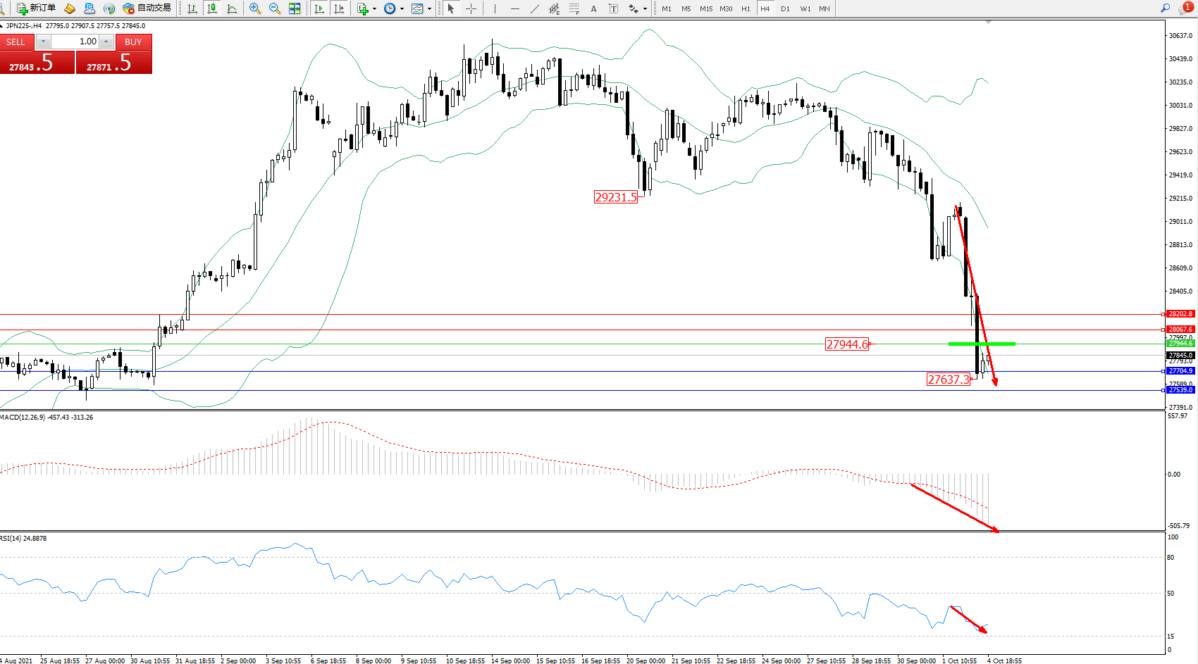 日经指数JPN225——4小时K线图显示: