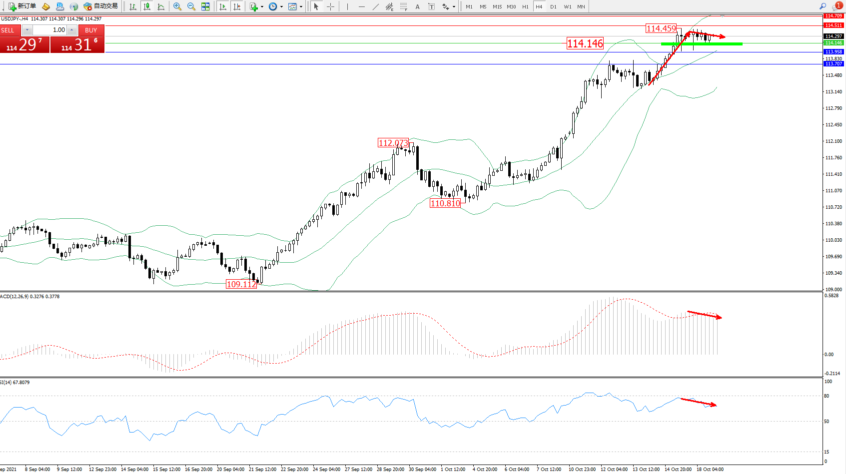 技术点评:多头动力延续布林带指标通道中上轨区间持续震荡上扬,高位抵达114.459位置后开始维持整理平移,布林带指标呈收口走势后开始向上移动中,MACD指标处于多头区域维持弱势整理平移后有缓慢下行迹象,RSI指标处于多头区域维持弱势徘徊;