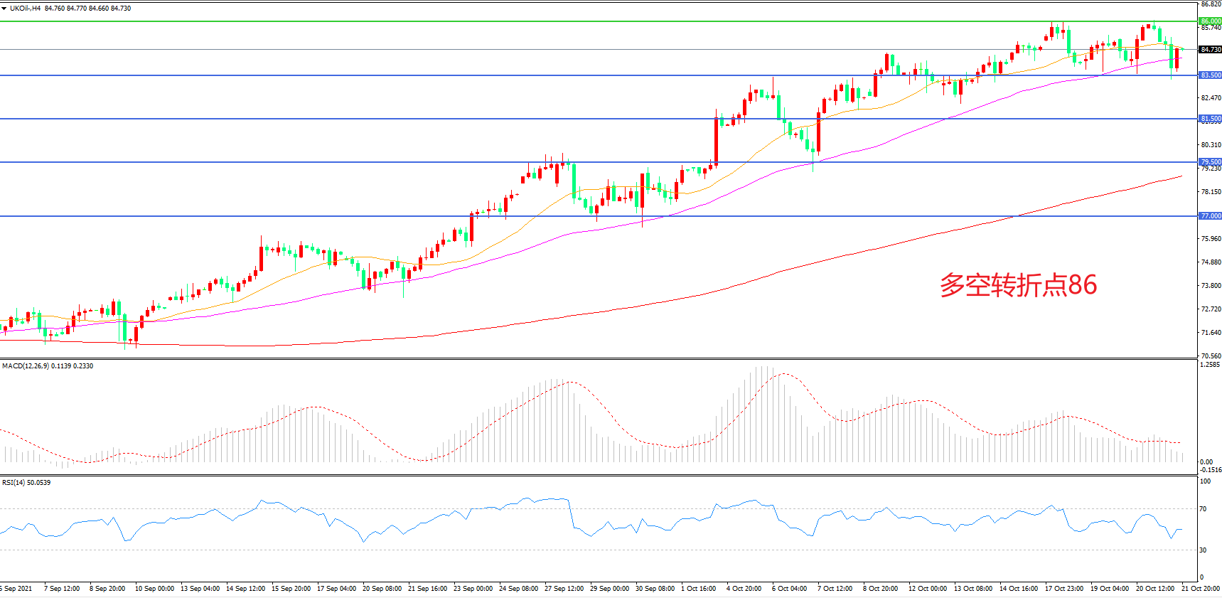 4小时图看,油价以21均线为依托,整体呈现上行形态,MACD红柱增加,RSI指标走平,日内延续上行概率较大。