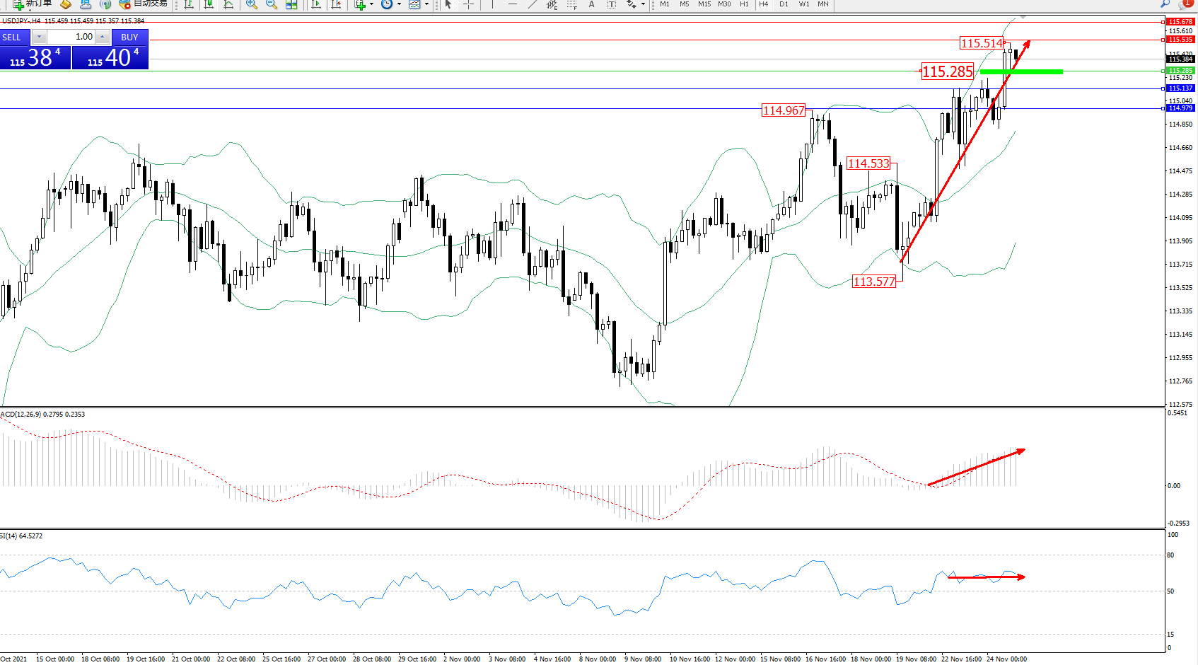 交易策略:115.285上方看涨,目标115.535、115.678