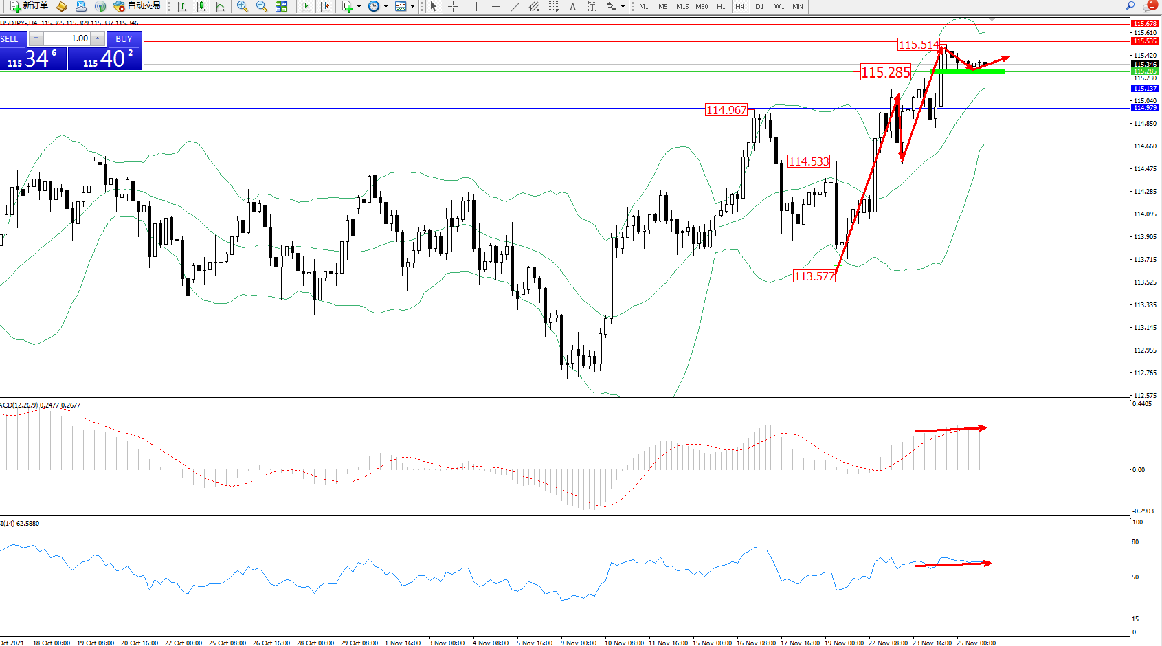 技术点评:多头动力延续布林带指标通道中上轨区间持续震荡上扬,高位滴滴115.514位置短期遇阻整理平移,空头动力伺机入场迹象,布林带指标呈收口走势持续中,MACD指标处于多头区域高位整理平移,RSI指标处于多头区域维持弱势徘徊中;