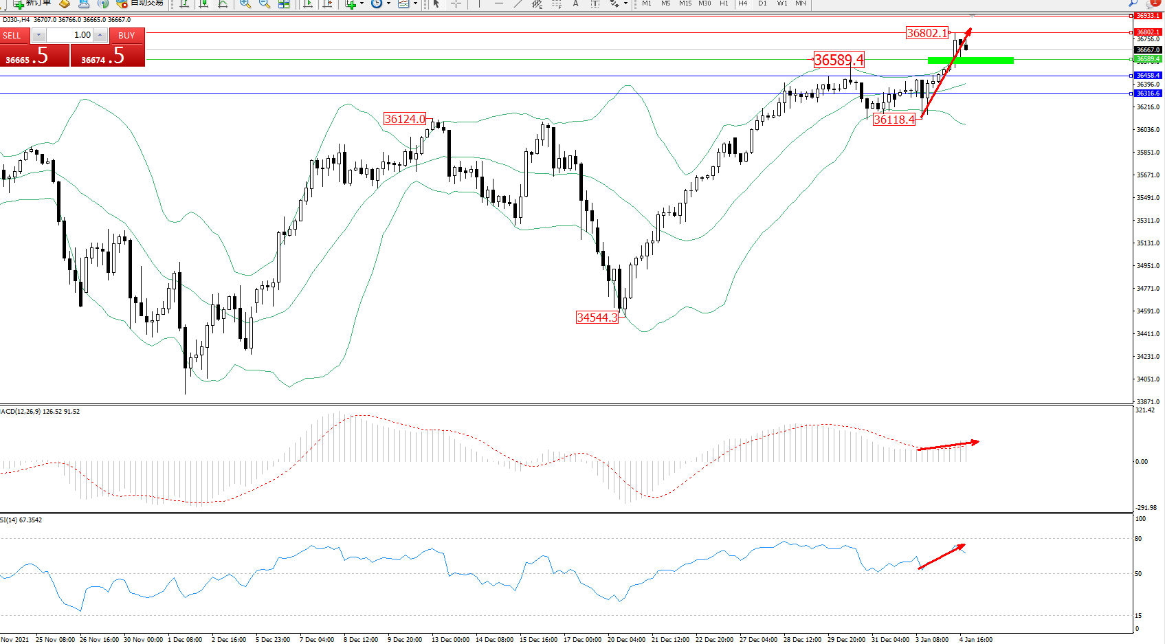 道琼斯指数DJ30——4小时K线图显示: