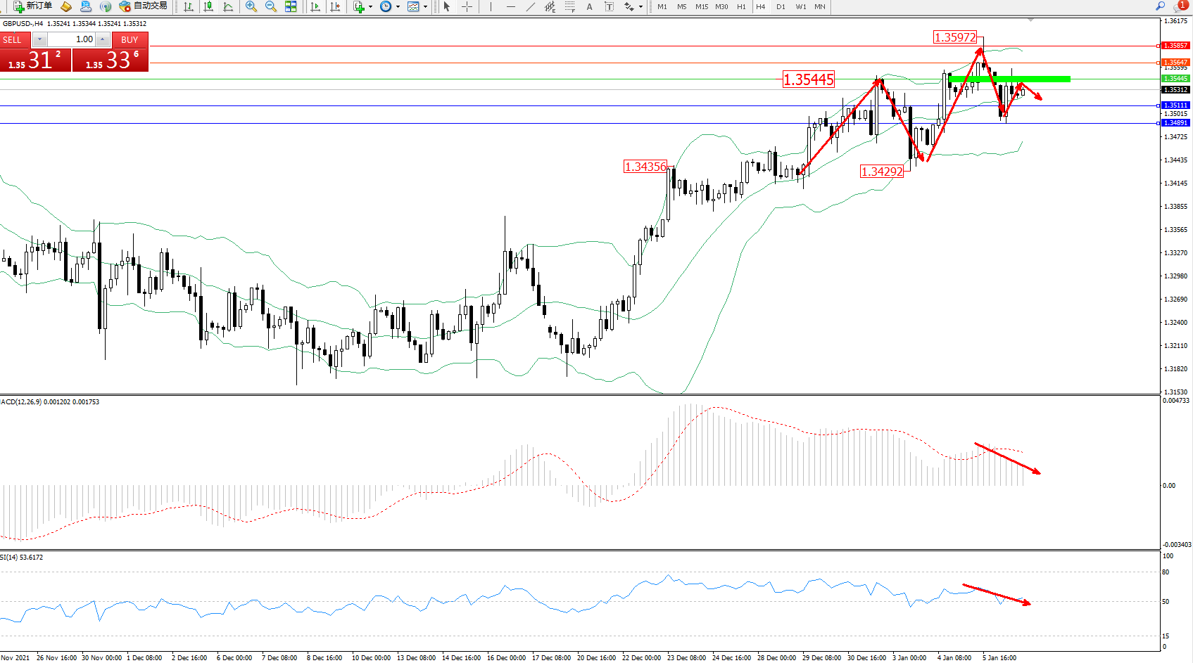 交易策略:1.35445下方看跌,目标1.35111、1.34891