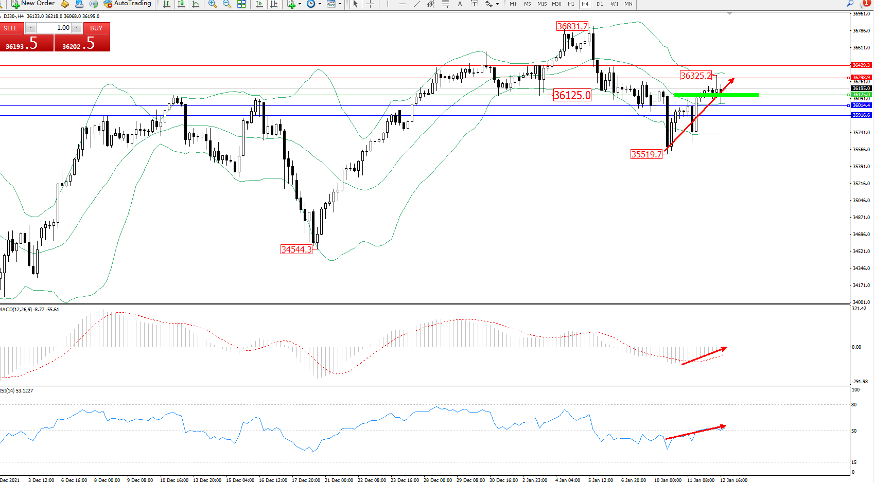 道琼斯指数DJ30——4小时K线图显示: