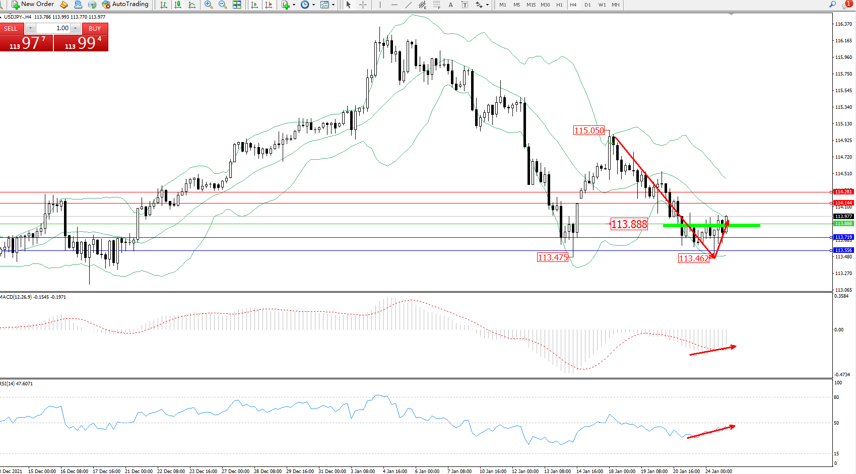 备选策略:113.888下方看跌,目标113.719、113.556
