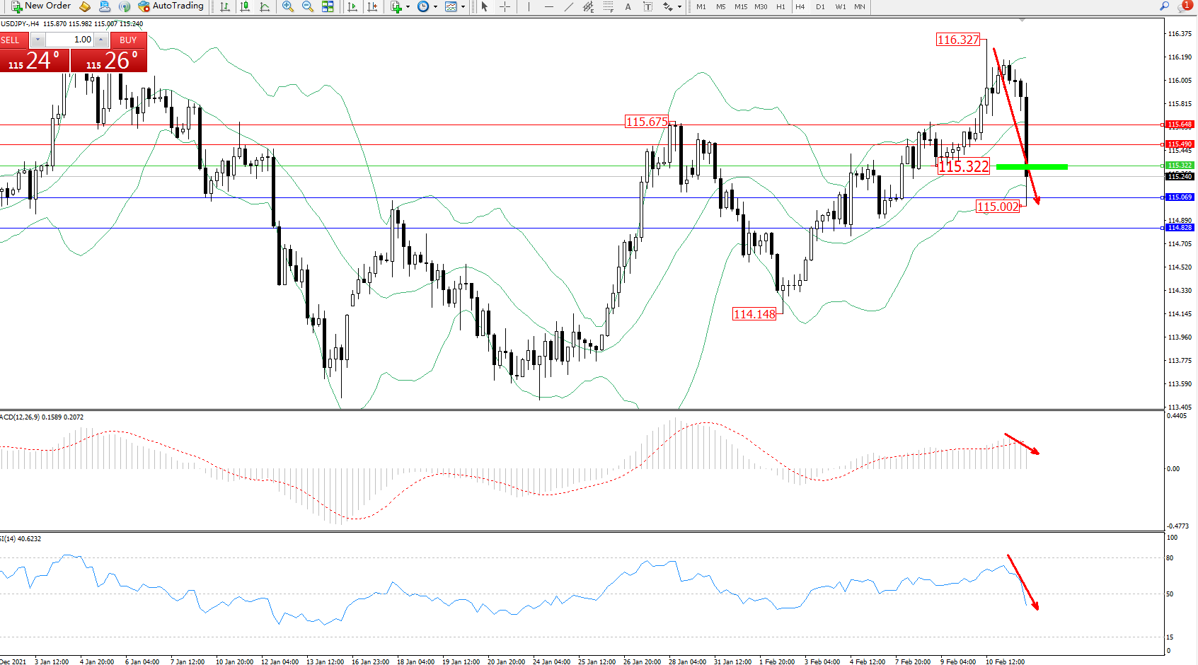 交易策略:115.322下方看跌,目标115.069、114.828