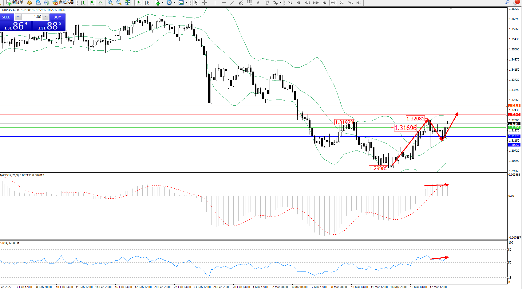 交易策略:1.31696上方看涨,目标1.32240、1.32616