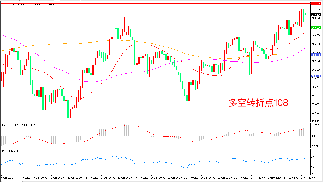 上周五(5月6日),俄乌双方在乌克兰东部地区激战持续,OPEC+拒绝增产的态度让油价再度飙升,美国WTI原油大幅上行,收报110.18美元/桶。欧盟计划对俄罗斯石油实施禁令仍在讨论中,一些欧洲内陆国家仍持反对意见,总体来说油价处在一个利多集中发力的时间窗口,后续延续强势概率较大。